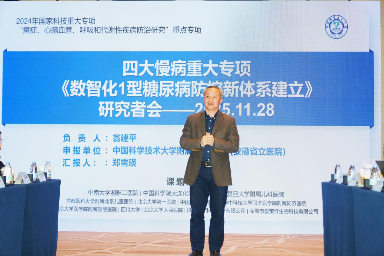 2025年11月28日,由中国科学技术大学附属第一医院(安徽省立医院)牵头承担的“癌症、心脑血管、呼吸和代谢性疾病防治研究国家科技重大专项”(简称“四大慢病”国家科技重大专项)——《数智化1型糖尿病防控新体系建立》项目研究者会于安徽合肥顺利召开,来自中国科学技术大学附属第一医院(安徽省立医院)、中南大学湘雅二医院、中国科学院大连化学物理研究所、复旦大学附属儿科医院、首都医科大学附属首都儿童医学中心、北京大学第一医院、中国科学技术大学、华中科技大学同济医学院附属同济医院、南京大学医学院附属鼓楼医院、四川大学、北京大学人民医院、讯飞医疗科技股份有限公司、深圳市爱宝惟生物科技有限公司等项目参与单位的专家学者齐聚一堂,围绕1型糖尿病(T1D)高危人群队列建设、数智化管理平台搭建以及标准化诊疗流程体系构建等核心议题展开深入研讨。
